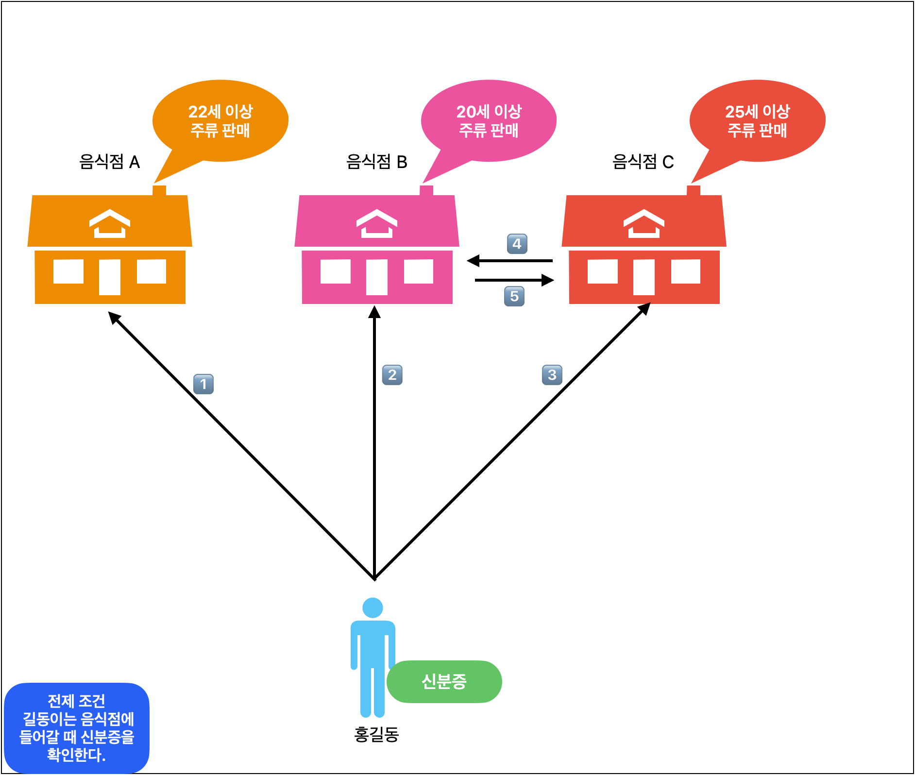 홍길동 → 음식점 B : 신분증 인증 후 주류 정책(20세 이상)까지 통과!