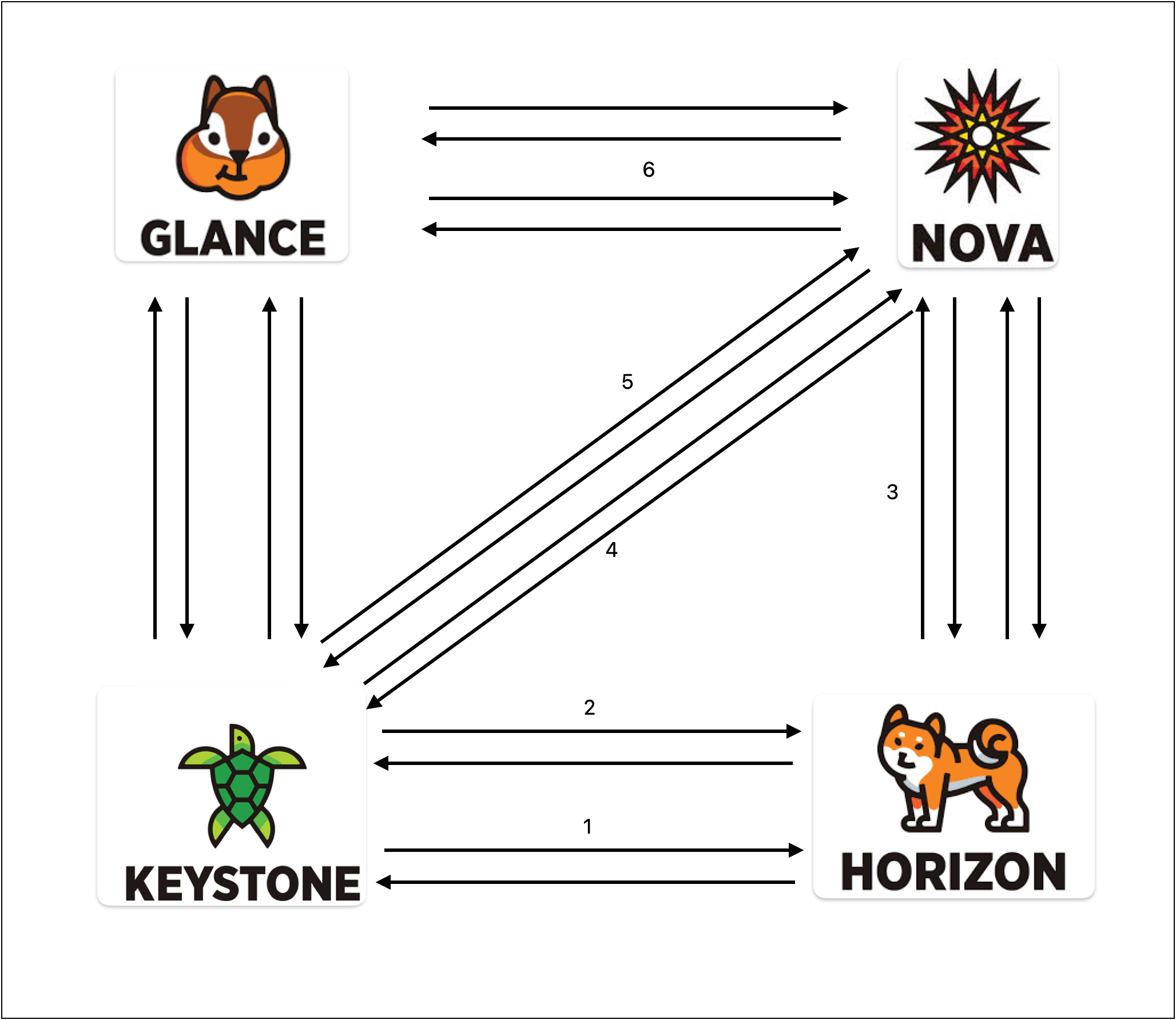 - Horizon에서는 Nova에게 VM 생성 요청 통신을 위해 Keystone에서 토큰 발급을 진행합니다.
