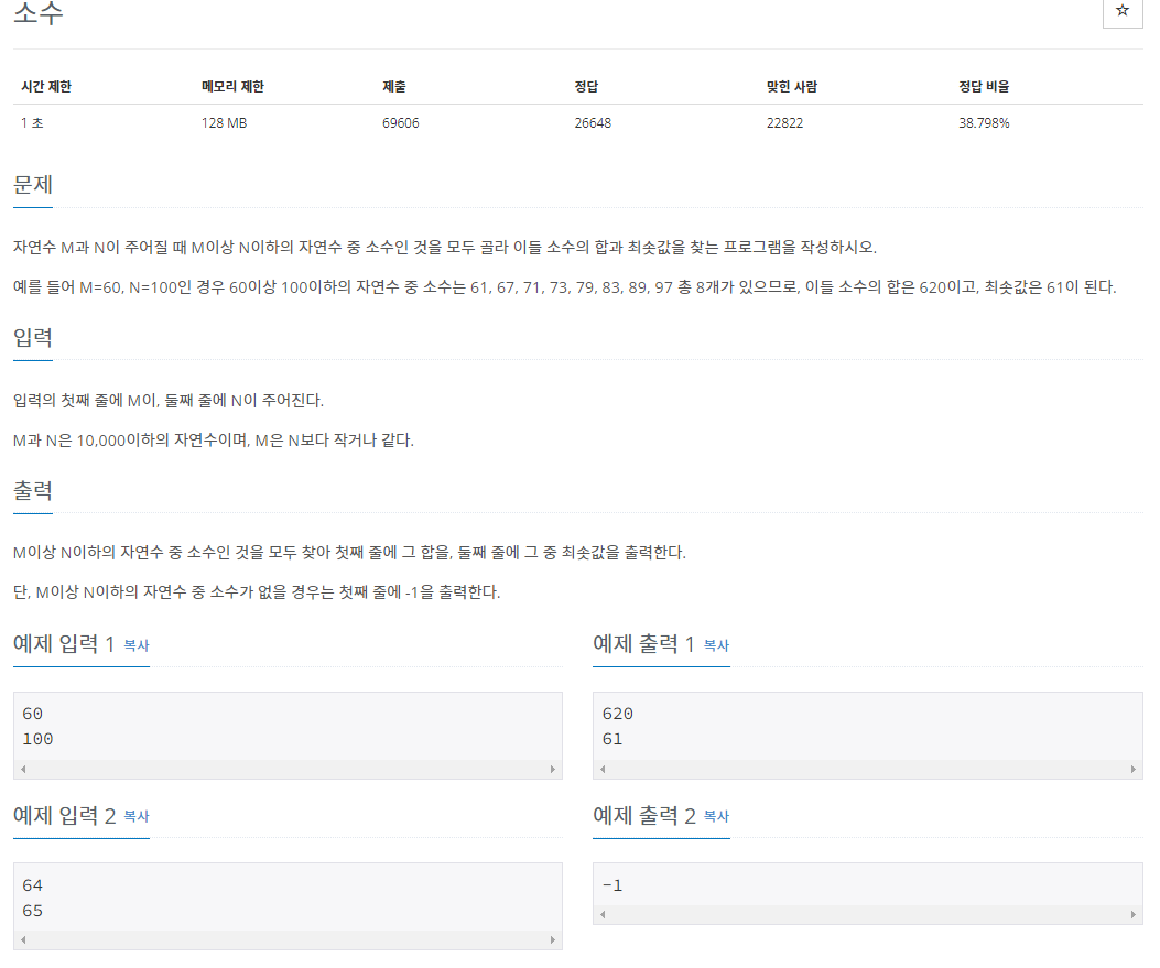 - min값은 for문을 시작값부터 증가하기 때문에 처음에 찾은 소수가 최솟값이다.