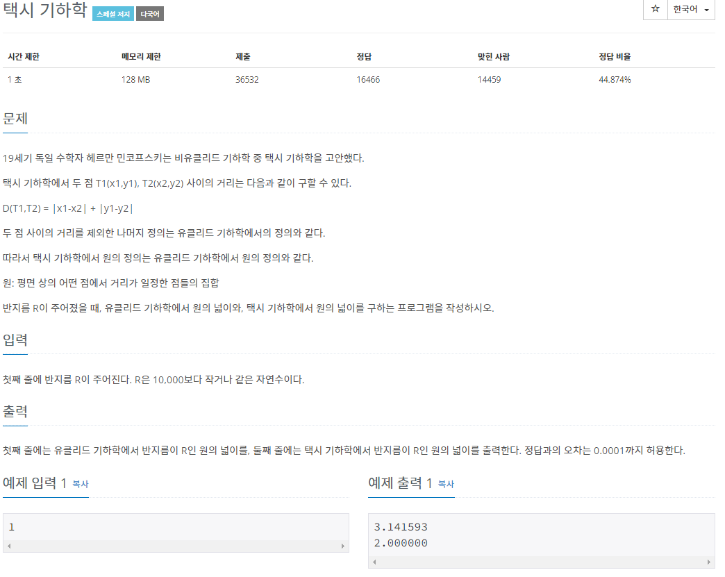 - 원의 넓이, 택시기하학의 원의 넓이를 구하는 함수 circleArea,texiArea를 만들었습니다.