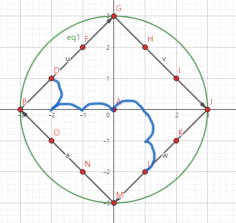 파란색으로 그려진 것을 살펴보면 택시기하학에서는 대각선으로 이동하지 못하기 때문에 한 블록씩 이동하며 반지름이 3이기 때문에 파란색처럼 이동하여 도착하는 지점이 마름모 형태로 만들어질 수 있습니다.