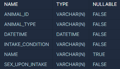 ANIMAL_INS 테이블 구조는 다음과 같으며, ANIMAL_ID, ANIMAL_TYPE, DATETIME, INTAKE_CONDITION, NAME,SEX_UPON_INTAKE는 각각 동물의 아이디, 생물 종, 보호 시작일, 보호 시작 시 상태, 이름, 성별 및 중성화 여부를 나타냅니다.