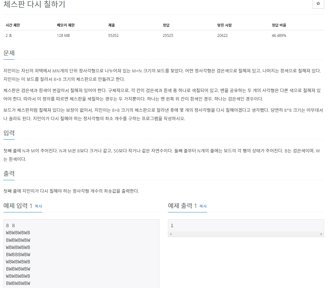 체스판에 첫 색깔이 B(Black), W(White)인 모든 경우의 수를 비교하여 최소 색칠 횟수를 구하였습니다.