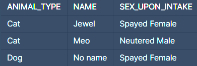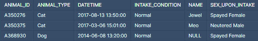 - SQL 문의 조회 명령어 SELECT문에서 ANIMAL_TYPE,NAME,SEX_UPON_INTAKE를 출력해야 한다.