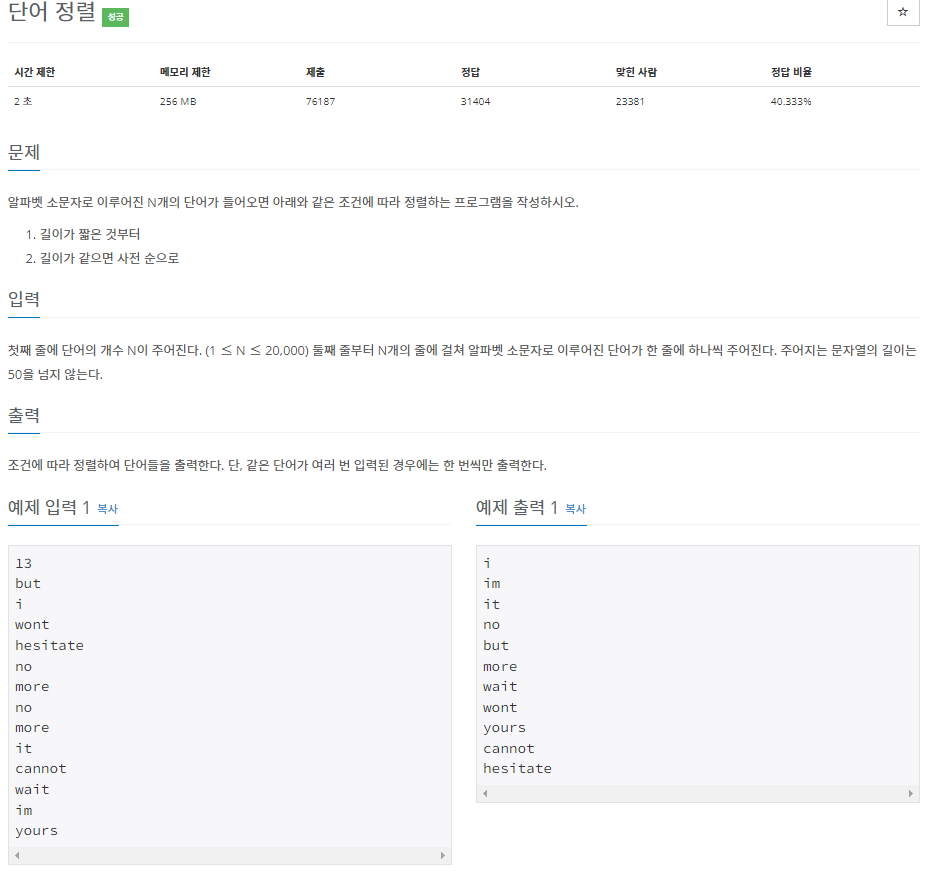 - String 타입의 길이가 같으면 사전순으로 정렬하도록 하였습니다.