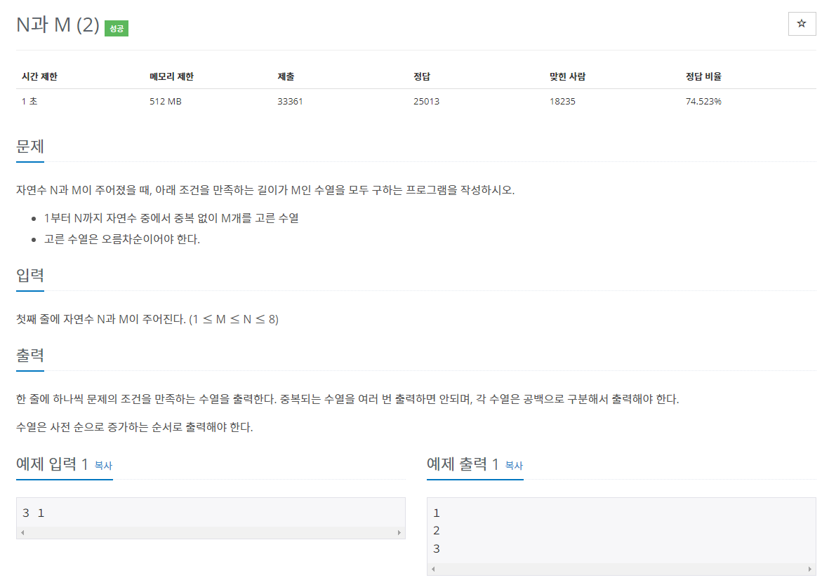 - M길이의 오름차순 수열을 구하는 함수 backTracking을 만들었습니다.