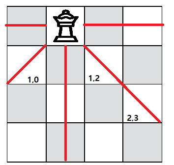 퀸이 놓인 위치를 (0,1)의 좌표라고 생각하고 대각선 좌표는 (1,0) , (1,2) , (2,3)이 존재합니다.