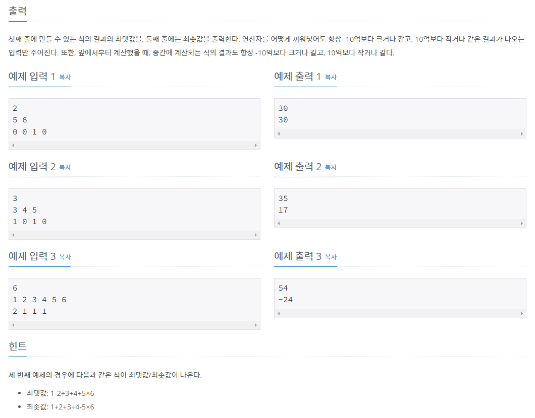 이 문제에 경우 연산에 대한 모든 경우의 수를 확인하여 최대값 및 최소값을 구하는 것으로 깊이 우선 방식과 차이점이 없습니다.