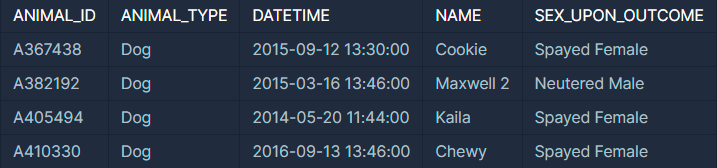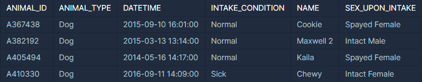 - LIKE를 사용하여 ANIMAL_INS에는 Intact로 시작하는 단어를 ANIMAL_OUTS에는 Spayed나 Neutered로 시작하는 단어를 가진 행만 출력하도록 WHERE문을설정하였습니다.