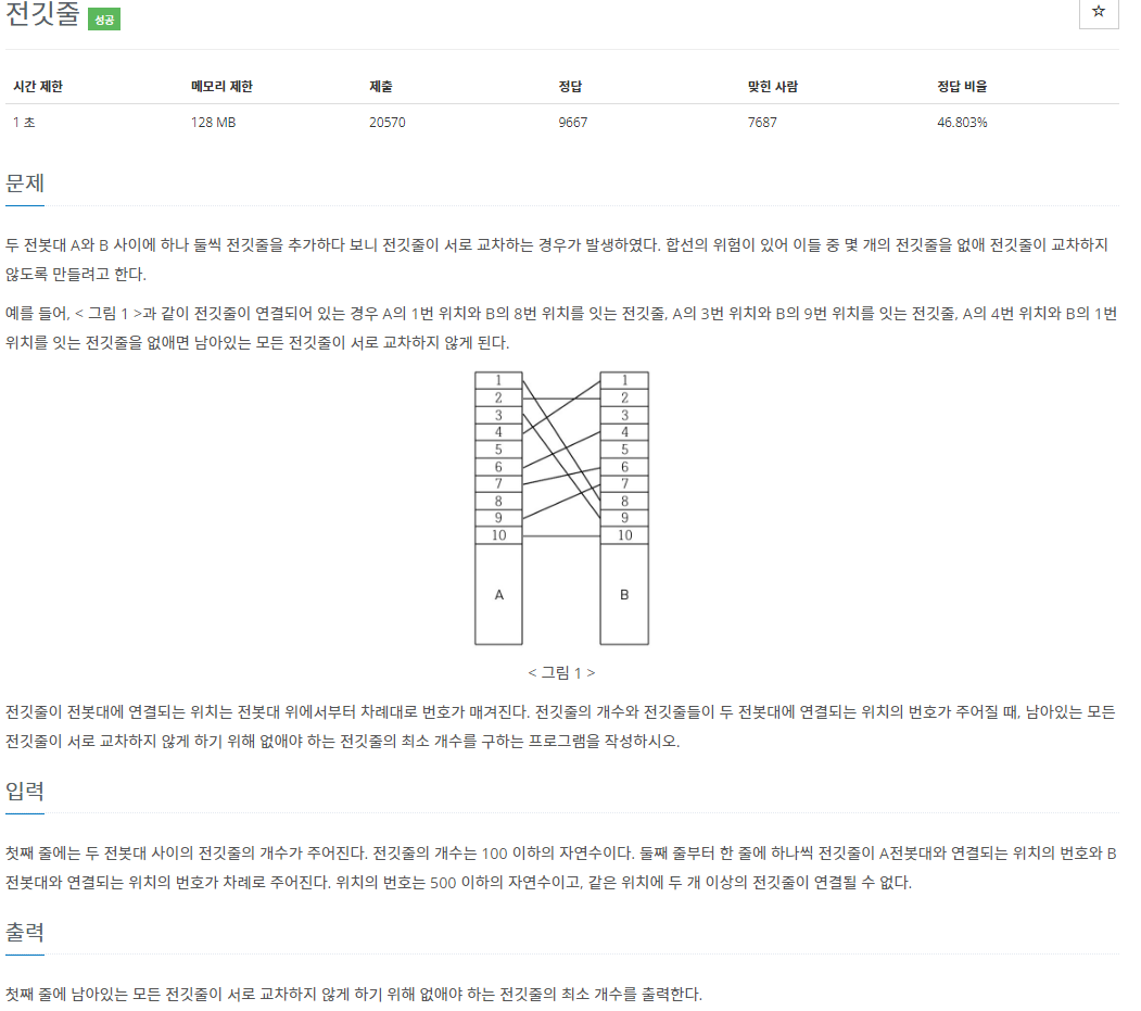 - 문제에서는 없앤 전깃줄의 최소값을 구해야 하기 때문에 전체 전깃줄 - 최대 연결된 전깃줄 수를 연산하였습니다.