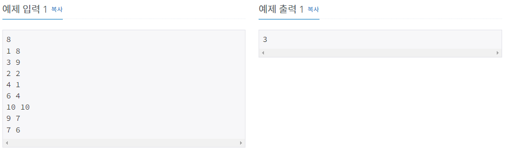 각 전기줄이 연결하는데 마지막 전깃줄이라고 생각하고 교차하지 않고 각각의 최대한 연결할 수 있는 횟수를 구하였습니다.