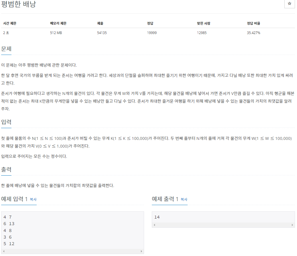 배낭에 물건을 넣을 때에 최대의 가치를 넣을 때를 표로 만들었습니다.