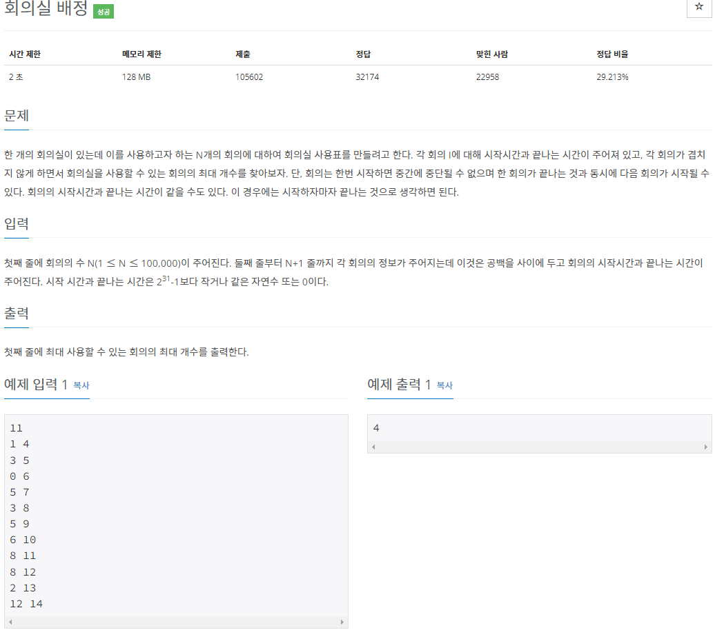 이 문제에서는 최대의 회의실 사용횟수를 구하려면 현재 시간에서 최소로 끝날 수 있는 시간을 찾아서 그 회의를 반복하는 것입니다.
