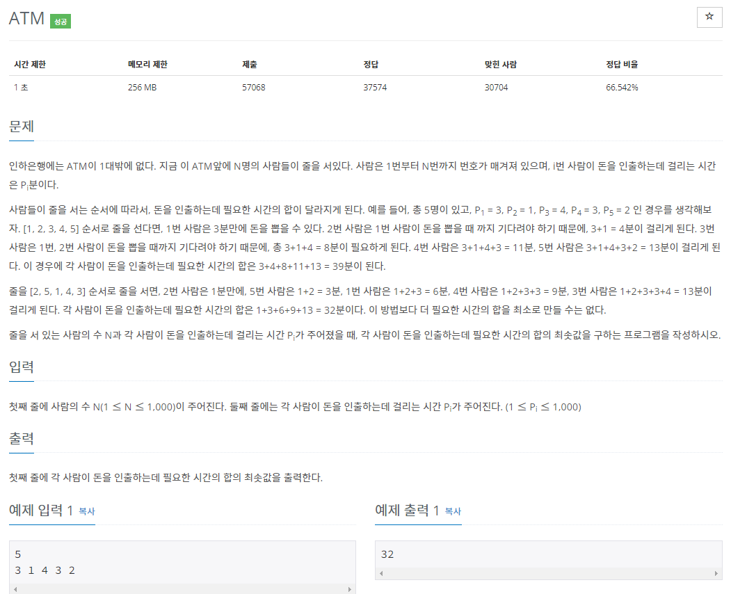 이 문제에서는 ATM대기시간을 최소로 하려면 대기시간이 낮은 순으로 ATM을 사용하여야 합니다.