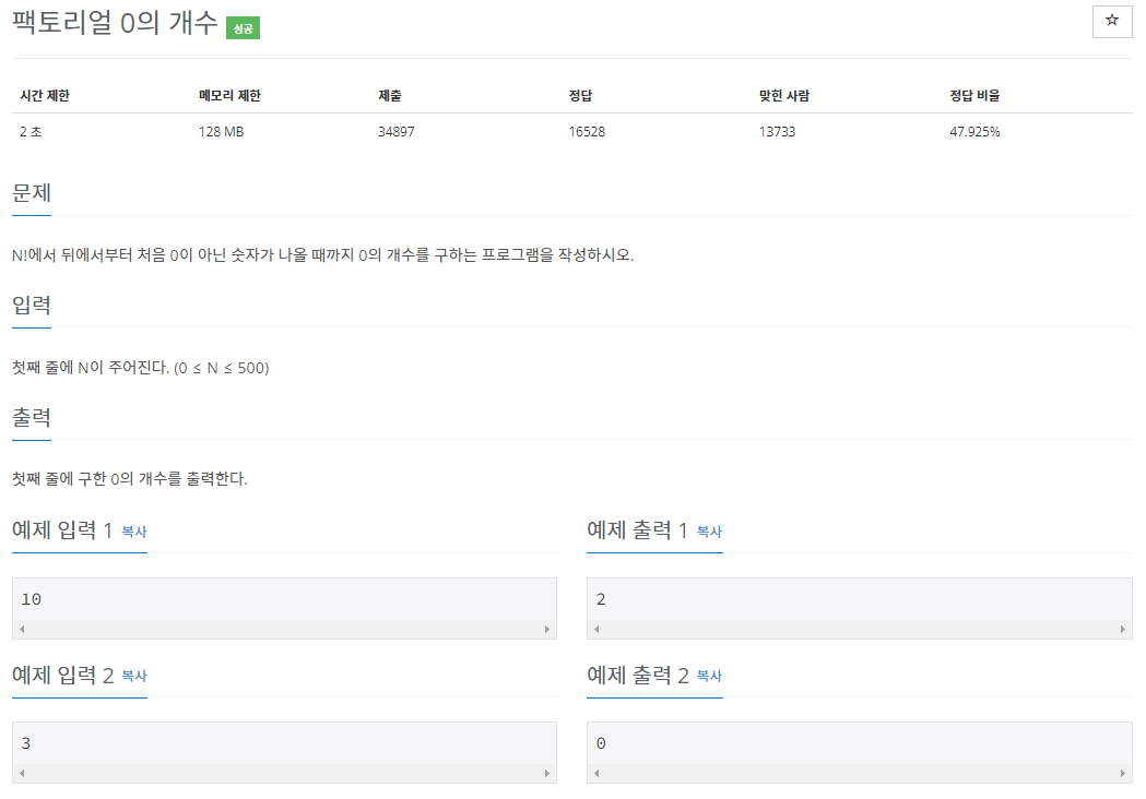 이 문제는 0이 나오려면 10의 배수가 나와야 하는데 10 = 5*2로 표현이 가능합니다.