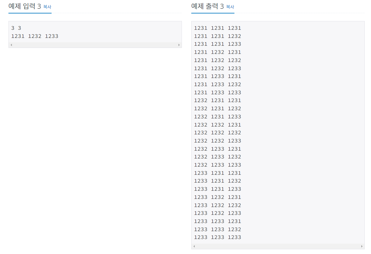 - 중복 가능하기 때문에 for문의 반복 횟수가 수열의 들어갈 수 있는 모든 수를 포함시키도록 하였습니다.