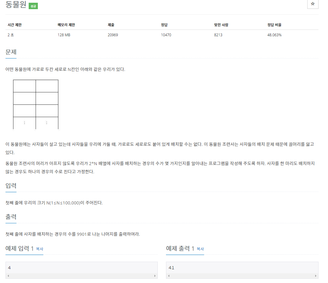 DP[][] 배열을 이용하여 우리에 살 수 있는 사자의 경우의 수를 구하였습니다.