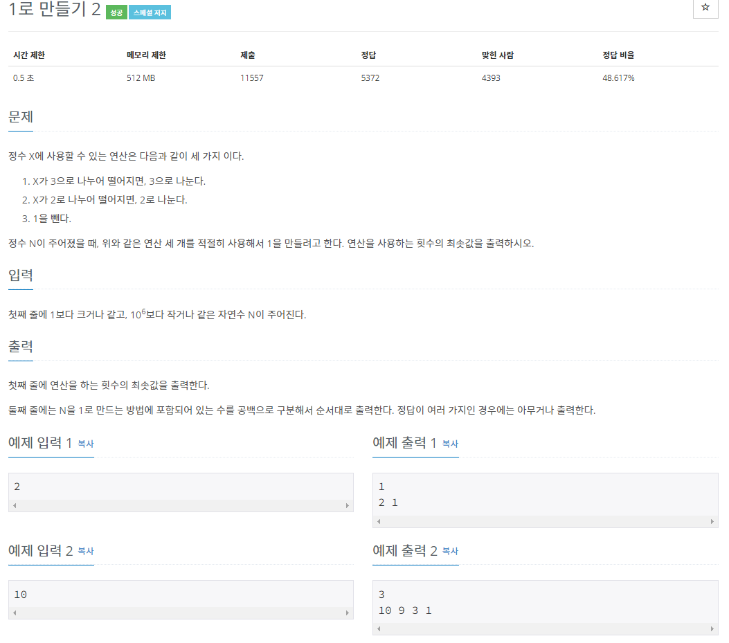 bw.write(count[N]+ "\n"); //최소 연산 횟수 BufferedWriter 저장