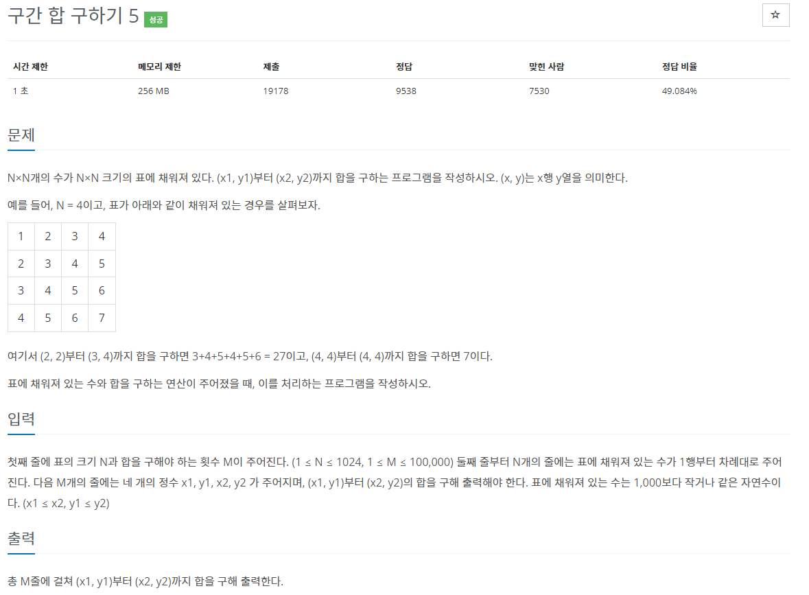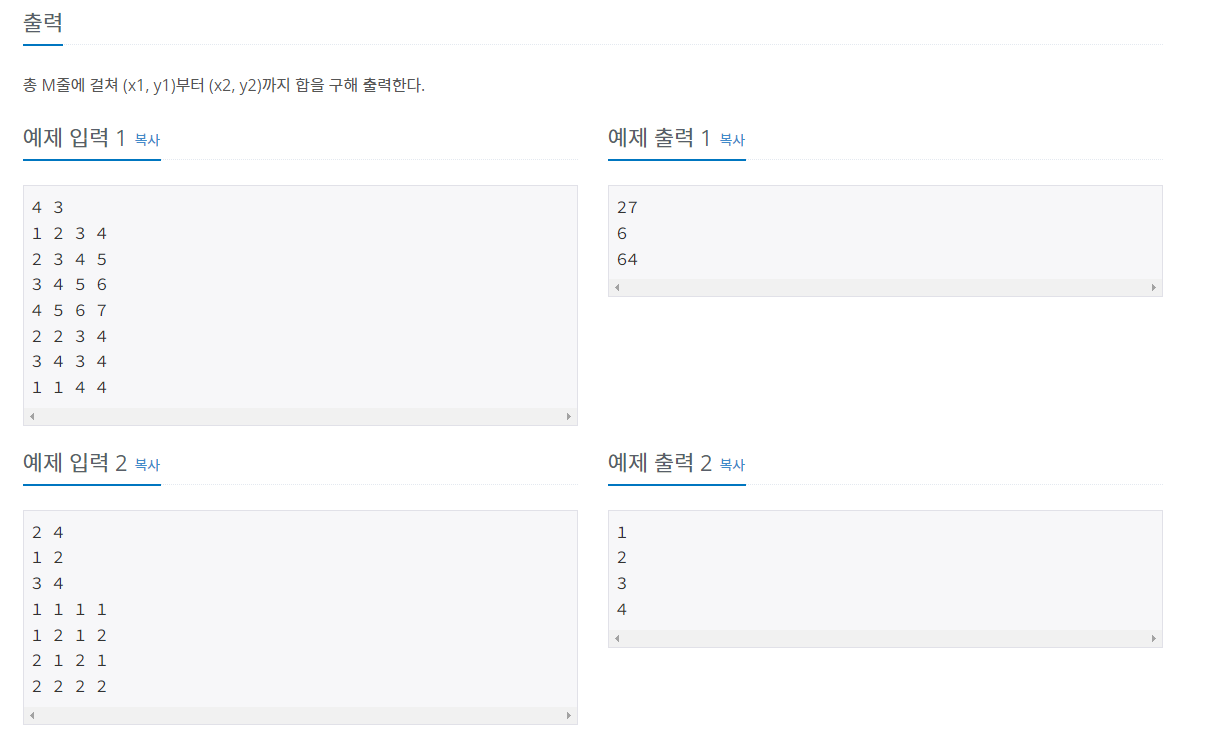 1. 입력되는 N × N의 수에서 (x1, y1), (x2, y2) 구간의 합을 구합니다.