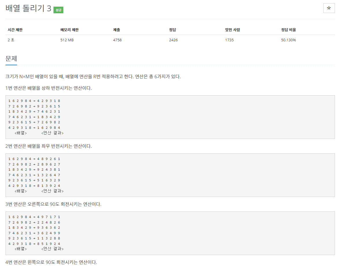 크기가 N×M인 배열이 있을 때, 배열에 연산을 R번 적용하려고 한다. 연산은 총 6가지가 있다. 1번 연산은 배열을 상하 반전시키는 연산이다. 1 6 2 9 8 4 → 4 2 9 3 1 8 7 2 6 9 8 2 → 9 2 3 6 1 5 1 8 3 4 2 9 →