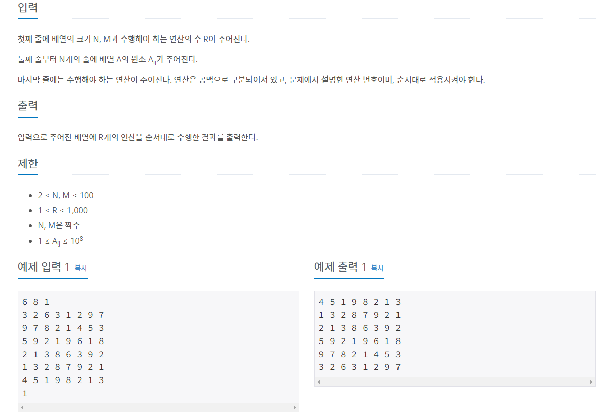 1. 입력값 N×M 배열의 값과 R개의 연산을 받았습니다.
