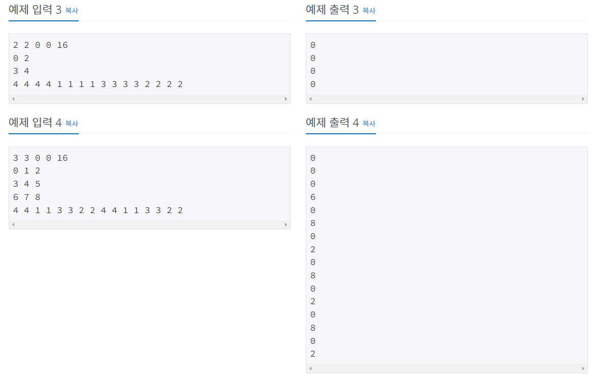 첫째 줄에 지도의 세로 크기 N, 가로 크기 M (1 ≤ N, M ≤ 20), 주사위를 놓은 곳의 좌표 x, y(0 ≤ x ≤ N-1, 0 ≤ y ≤ M-1), 그리고 명령의 개수 K (1 ≤ K ≤ 1,000)가 주어진다. 둘째 줄부터 N개의 줄에 지