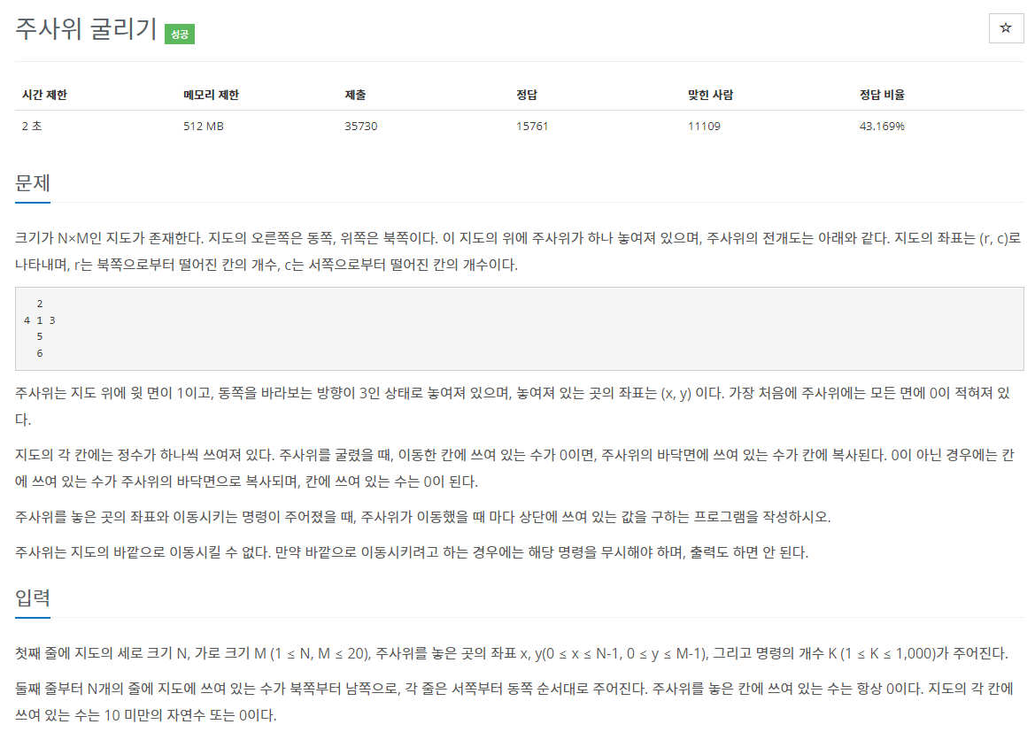 주사위 움직일 때 주사위 배열 변경되는 방법과 지도의 값들의 변화를 이용하여 알고리즘을 작성하면 됩니다.
