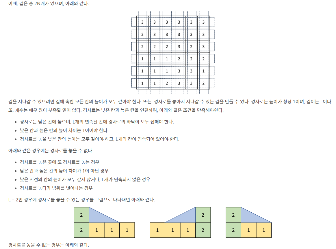 경사로를 놓고 높이가 낮은 길로 올라가려면 내려가려는 길의 다음 연속적인 길들이 같은 높이의 L개가 존재하면 가능합니다.