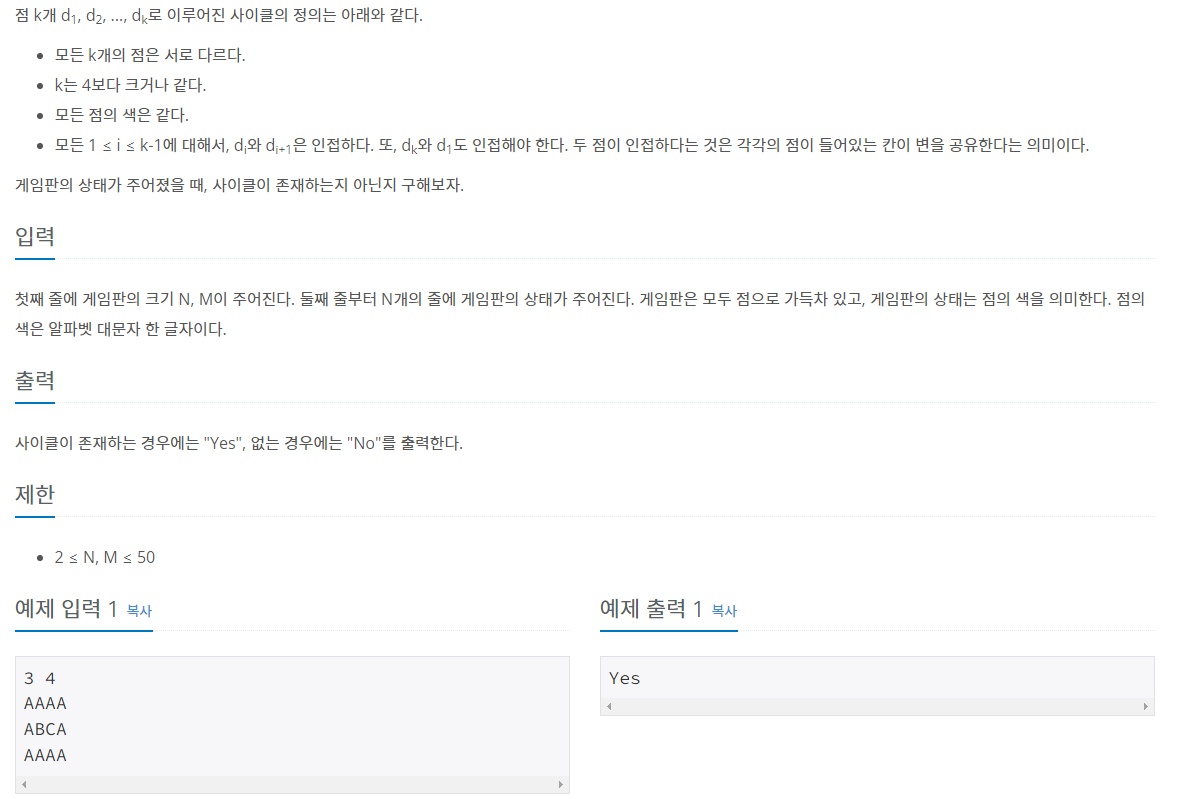 - dfs함수는 DFS로 탐색하여 4개 이상의 점을 지나는 사이클이 존재하는지 확인하는 함수입니다.