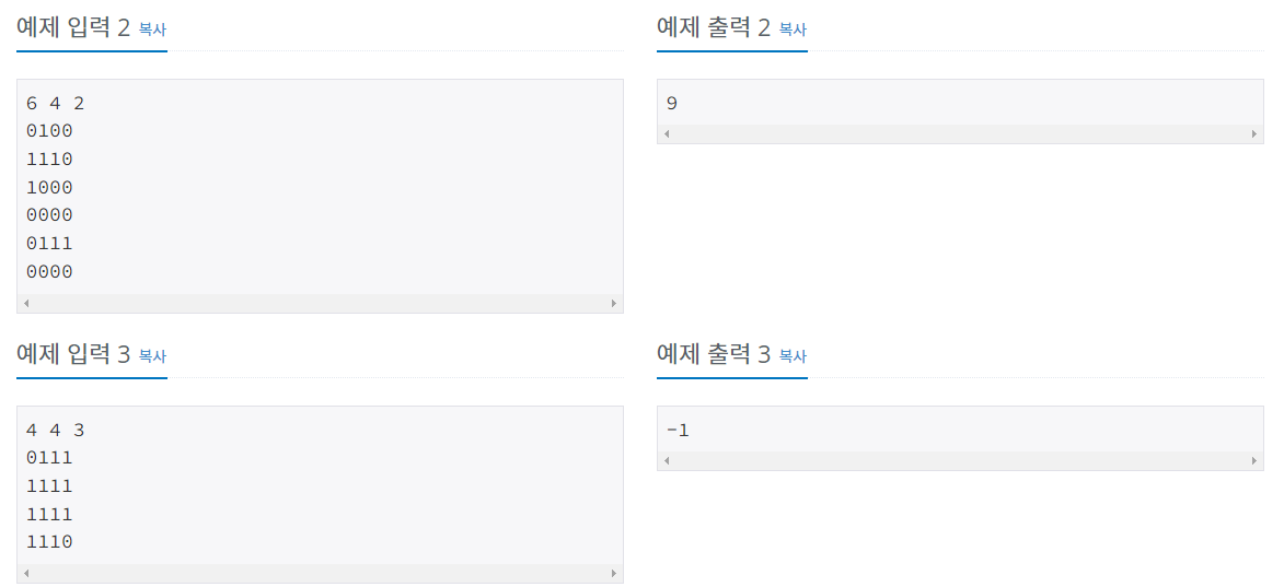 첫째 줄에 N(1 ≤ N ≤ 1,000), M(1 ≤ M ≤ 1,000), K(1 ≤ K ≤ 10)이 주어진다. 다음 N개의 줄에 M개의 숫자로 맵이 주어진다. (1, 1)과 (N, M)은 항상 0이라고 가정하자.