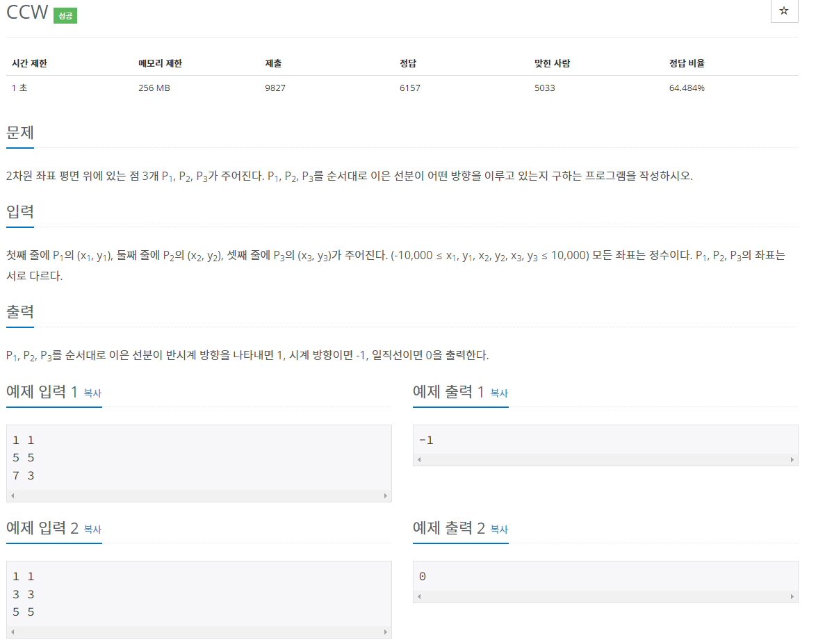 3. 반시계이면 1, 시계이면 -1, 일직선이면 0을 결과로 출력합니다.