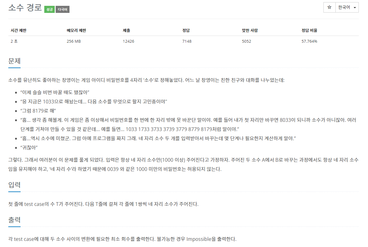 소수를 유난히도 좋아하는 창영이는 게임 아이디 비밀번호를 4자리 ‘소수’로 정해놓았다. 어느 날 창영이는 친한 친구와 대화를 나누었는데: “이제 슬슬 비번 바꿀 때도 됐잖아” “응 지금