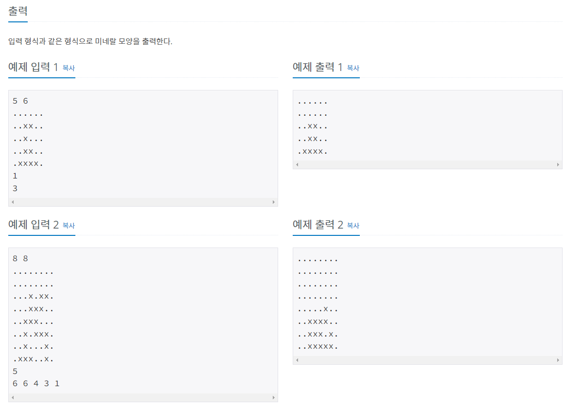 미네랄이 떠있는 것은 BFS로 구현하였으며 막대기를 던지는 것은 시뮬레이션 형태로 구현하였습니다.