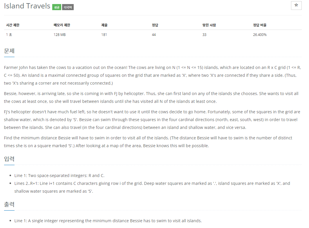 3. 베시의 시작위치의 섬은 자유롭게 선택이 가능하며 모든 섬을 방문했을 때 최소 수영 횟수를 결과로 출력합니다.