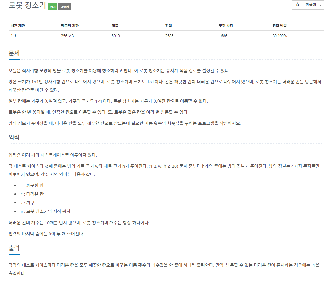 2. 'o'는 출발 지점, '.'은 깨끗한 공간, '*' 먼지가 존재하는 공간, 'x' 막힌 공간