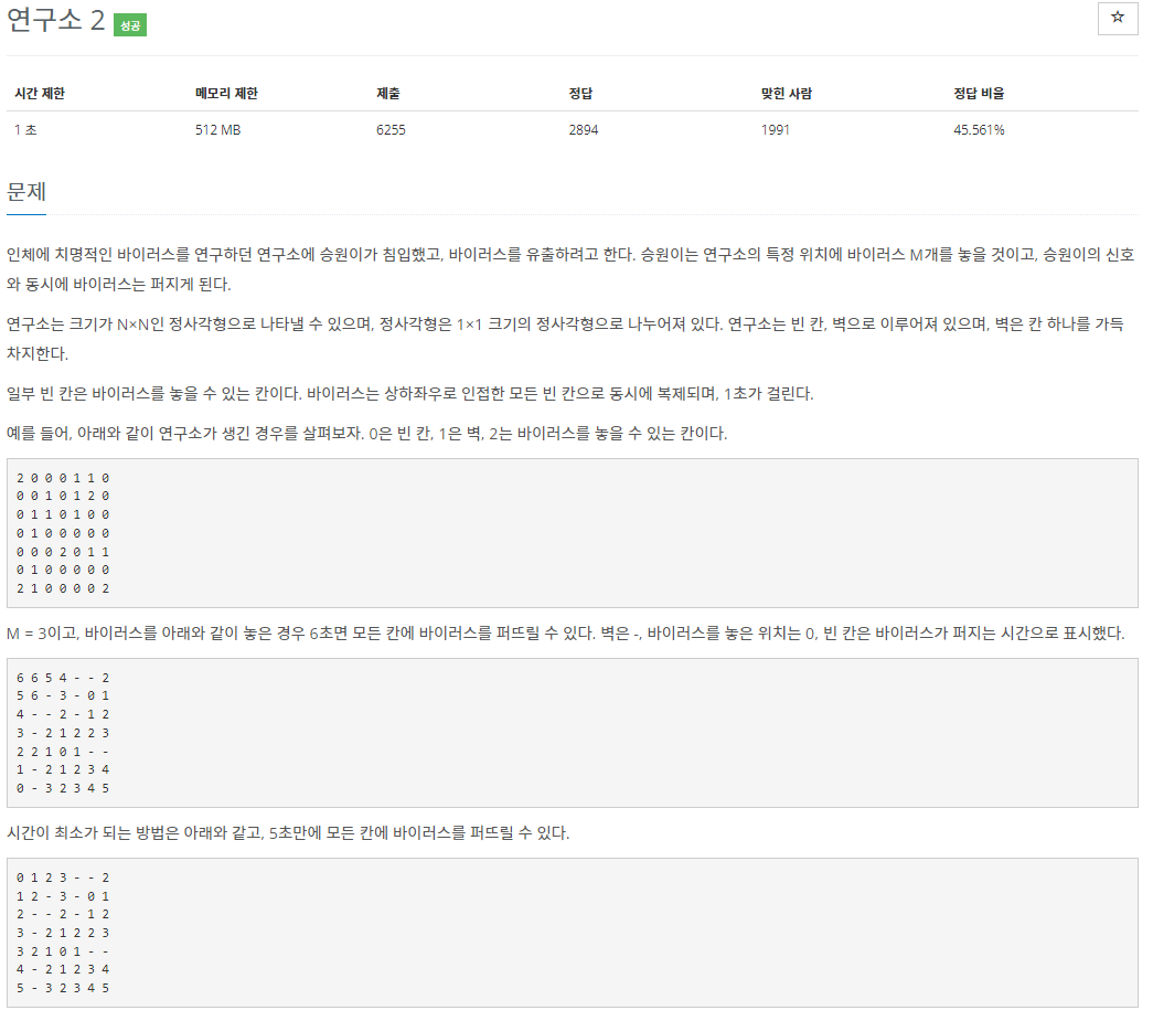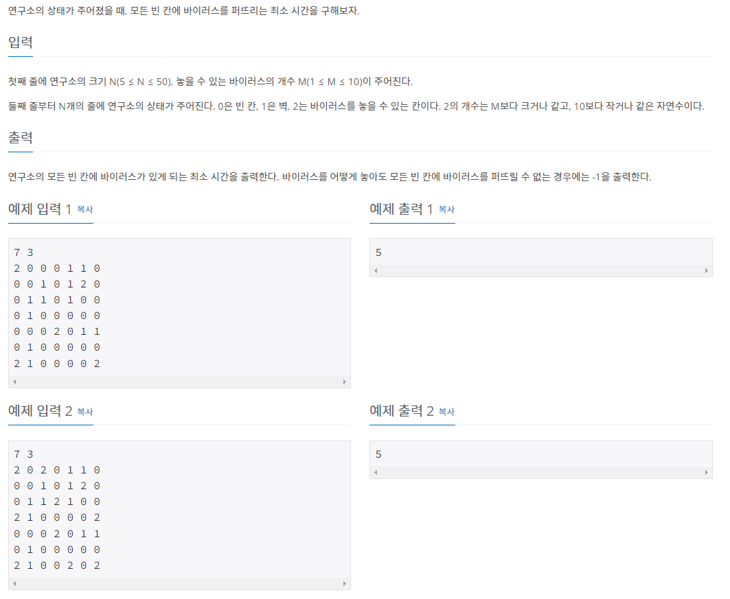 인체에 치명적인 바이러스를 연구하던 연구소에 승원이가 침입했고, 바이러스를 유출하려고 한다. 승원이는 연구소의 특정 위치에 바이러스 M개를 놓을 것이고, 승원이의 신호와 동시에 바이