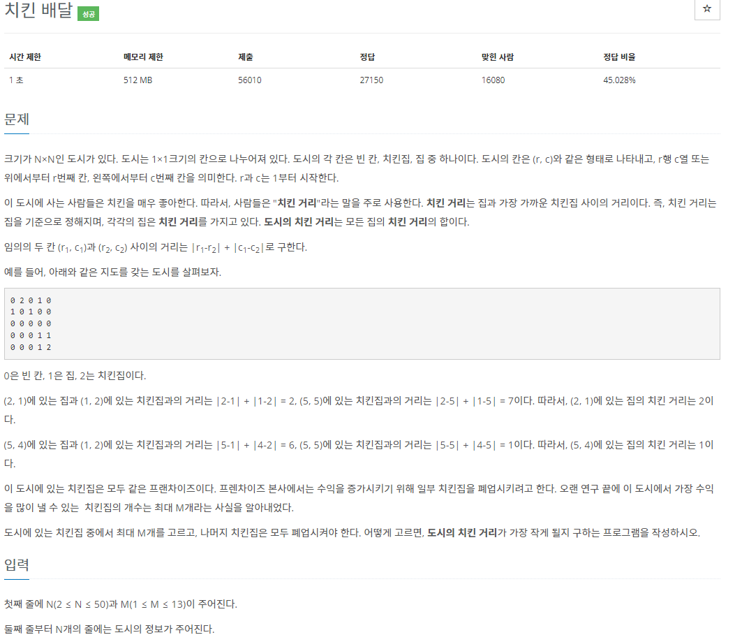 크기가 N×N인 도시가 있다. 도시는 1×1크기의 칸으로 나누어져 있다. 도시의 각 칸은 빈 칸, 치킨집, 집 중 하나이다. 도시의 칸은 (r, c)와 같은 형태로 나타내고, r행 c열 또는 위에서부터 r번째 칸