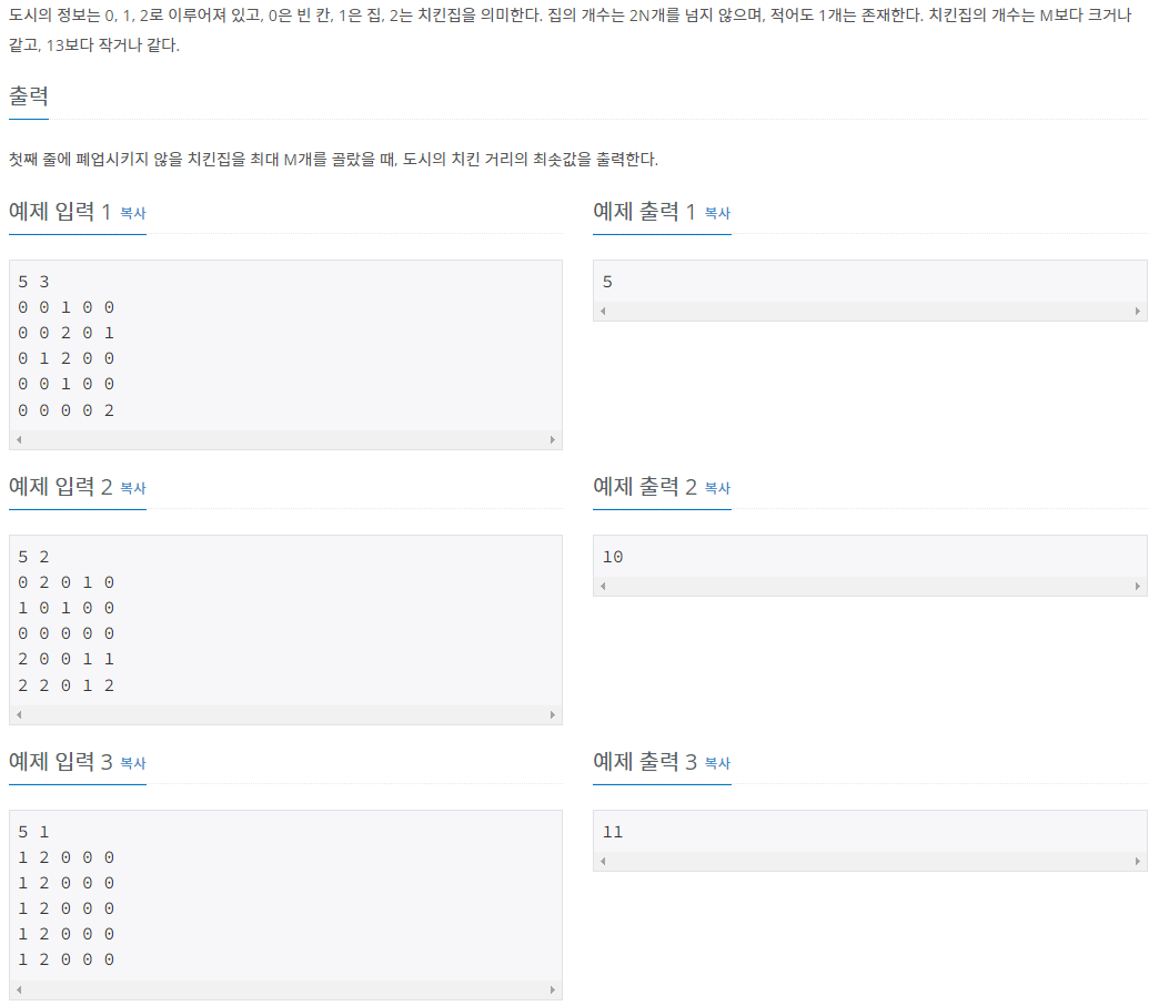 2. 치킨집을 M개 선택하는 모든 경우에서 도시의 치킨 거리의 최소값을 구합니다.