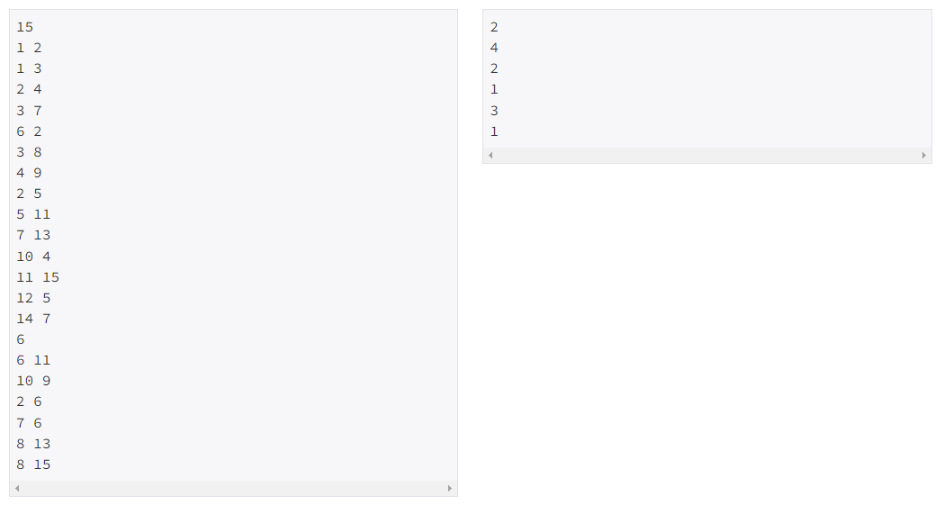 첫째 줄에 노드의 개수 N이 주어지고, 다음 N-1개 줄에는 트리 상에서 연결된 두 정점이 주어진다. 그 다음 줄에는 가장 가까운 공통 조상을 알고싶은 쌍의 개수 M이 주어지고, 다음 M개 줄에는 정