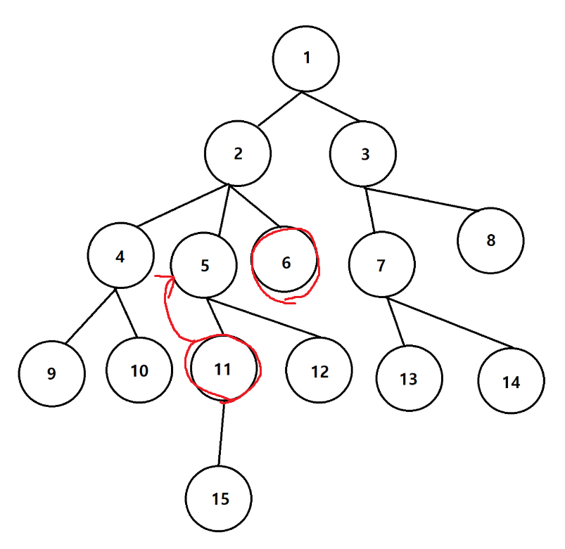 최소 공통 조상 노드 찾아야 할 쌍 : (6, 11), (10, 9), (2, 6), (7, 6), (8, 13), (8, 15)