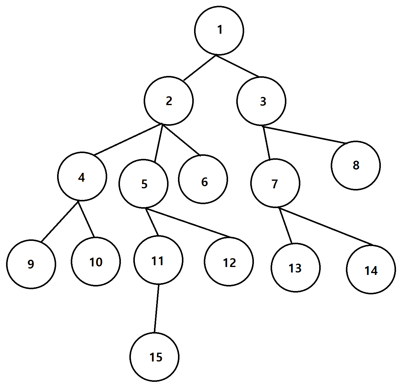노드 연결 쌍 : (1, 2), (1, 3), (2, 4), (3, 7), (6, 2), (3, 8), (4, 9), (2, 5), (5, 11), (7, 13), (10, 4), (11, 15), (12, 5), (14, 7)