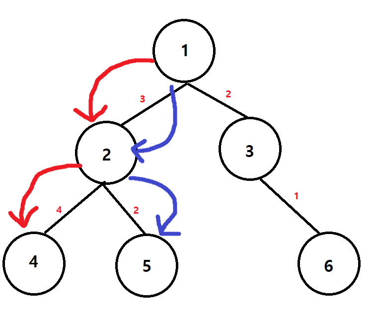 dis[4] + dis[5] = (1 → 2) + (2 → 4) + (1 → 2) + (2 → 5)