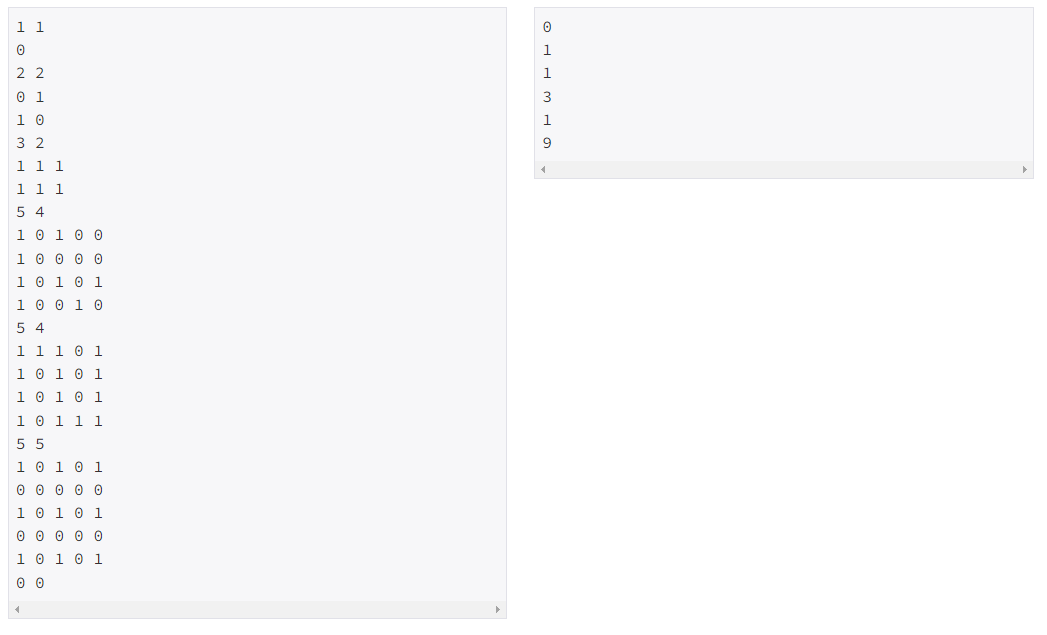 입력은 여러 개의 테스트 케이스로 이루어져 있다. 각 테스트 케이스의 첫째 줄에는 지도의 너비 w와 높이 h가 주어진다. w와 h는 50보다 작거나 같은 양의 정수이다. 둘째 줄부터 h개 줄에는 지도