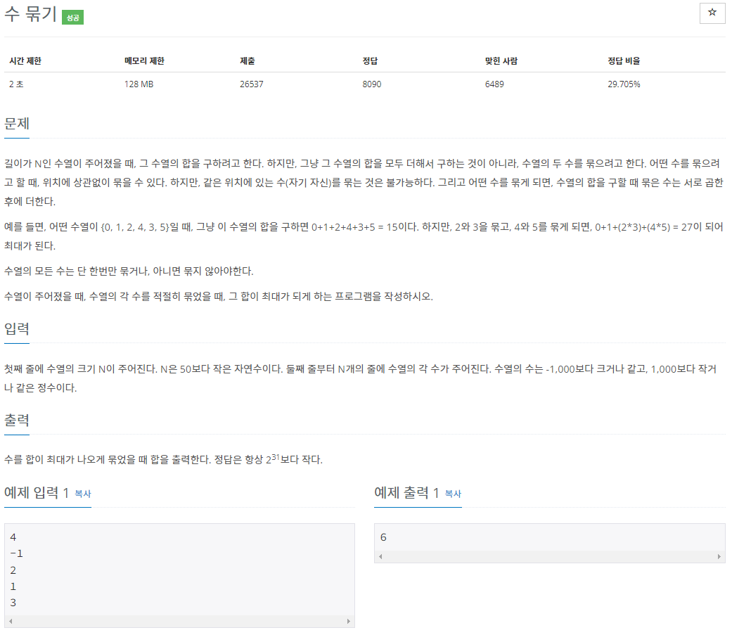 길이가 N인 수열이 주어졌을 때, 그 수열의 합을 구하려고 한다. 하지만, 그냥 그 수열의 합을 모두 더해서 구하는 것이 아니라, 수열의 두 수를 묶으려고 한다. 어떤 수를 묶으려고 할 때, 위치에