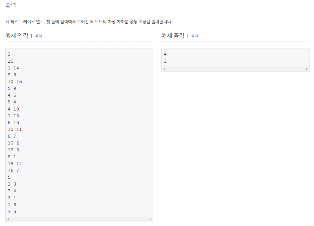 2. 주어지는 두 노드에 대하여 가장 가까운 공통 조상 노드를 결과로 출력합니다.