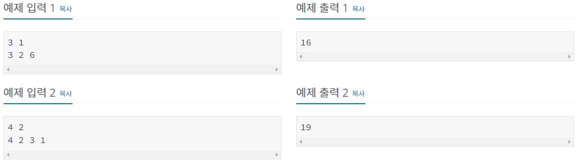 첫 번째 줄에 카드의 개수를 나타내는 수 n(2 ≤ n ≤ 1,000)과 카드 합체를 몇 번 하는지를 나타내는 수 m(0 ≤ m ≤ 15×n)이 주어진다. 두 번째 줄에 맨 처음 카드의 상태를 나타내는 n개의 자연수 a1,